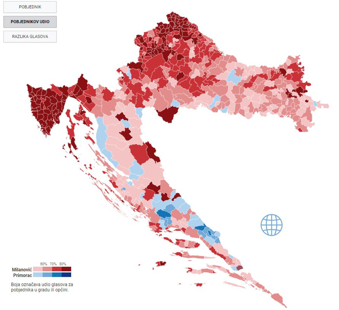 Bilo kako bilo, Milanović je osvojio 74,88 posto glasova, a Primorac 25,32 posto glasova prema rezultatima DIP-a koji se trenutačno temelje na 99,66 posto obrađenih biračkih mjesta. No sve te brojke teško je vizualizirati, a to je olakšao Luka Bulić koji je kreirao kartu na kojoj se može vidjeti kako se glasalo po gradovima i općinama. On je mladi ⁠doktorand politologije na Stanfordu u Kaliforniji koji je završio preddiplomski iz politologije i matematike na MIT-u u SAD-u. ⁠U svom znanstvenom radu se bavi izborima. Karta je na stranici izbori2024.pages.dev. Po njoj se vidi kako je Milanović itekako zacrvenio Hrvatsku.