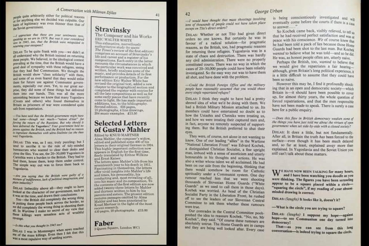 Milovan Đilas, vjerojatno jedan od najpoznatijih jugoslavenskih i svjetskih disidenata, sjeo je 1979. godine s novinarom i piscem Georgeom Urbanom i u dugom razgovoru za britanski magazin Encounter, dotakao se - između ostalog - i "repatrijacija" - dugo prešućivanu činjenicu da su britanske snage nakon rata izručile Jugoslaviji i SSSR-u do 40 tisuća ljudi koji su bježali iz zemlje te da su ih jugoslavenske vlasti poubijale.