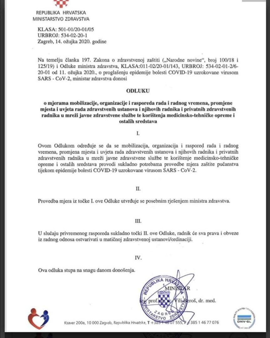 Naime, Beroš je 11. ožujka donio Odluku o proglašenju epidemije bolesti COVID-19, uzrokovane virusom SARS - CoV-2, temeljem koje je u subotu, 14. ožujka, donesena "Odluka o mjerama mobilizacije, organizacije i rasporeda rada i radnog vremena, promjene mjera i uvjeta rada zdravstvenih ustanova i njihovih radnika i privatnih zdravstvenih radnika u mreži javne zdravstvene službe te korištenja medicinsko-tehničke opreme i ostalih sredstava".