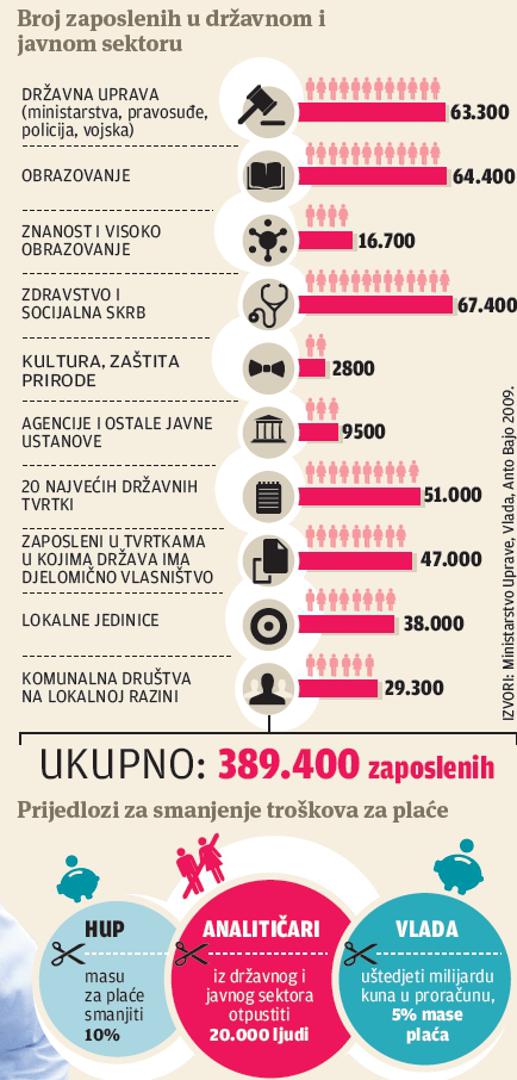 – To su kirurški viškovi koje trebati odrezati jako precizno. Državna uprava ima previše nekreativnog osoblja – tvrdi čelnik Nezavisnog sindikata znanosti i visokog obrazovanja Vilim Ribić. Analitičari već mjesecima ističu da treba otpustiti 20-ak tisuća ljudi, ali pritom prstom upiru na lokalnu razinu. Posljednji dostupni podaci govore da za lokalnu i regionalnu samoupravu te za komunalna poduzeća radi oko 66.800 građana.