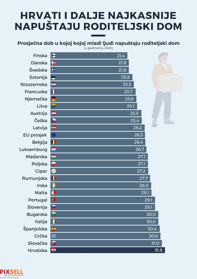 Istina, možemo se tješiti time da ima još zemalja u EU čiji mladi u prosjeku napuštaju roditeljski dom sa 30 i više godina. Tako Slovaci u prosjeku napuštaju obiteljsko gnijezdo s 31 godinom, Grci s 30,6 godina, Španjolci s 30,4 godine, Bugari i Talijani u prosjeku odlaze iz roditeljskog doma s 30 godina. S druge strane najranije iz roditeljskog doma odlaze Finci, koji se u prosjeku osamostaljuju sa 21,4 godine, zatim Šveđani i Danci sa 21,8 godina, te Estonci sa 22,8 godina. I Eurostat navodi kako je iseljenje iz obiteljskog doma ključna prekretnica u prijelazu iz djetinjstva u odraslu dob, a na nju utječu financijski aspekti odnosno troškovi stanovanja i troškovi života općenito, zatim stanje na tržištu rada, kulturološki faktori te jesu li mladi u vezi zbog čega će prije poželjeti napustiti obiteljsko gnijezdo, naravno, ako im to omogućavaju financijski uvjeti. Ovo potonje za većinu prosječnih mladih u Hrvatskoj nije trenutno lako izvedivo, no uvijek ostaje nada da će se možda Vlada ozbiljnije pozabaviti tom problematikom u sklopu porezne i stambene politike.