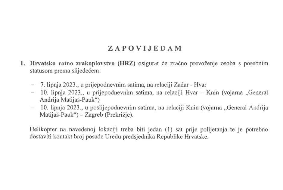 Ured predsjednika Republike dobio je u nedjelju 1. rujna izvješće načelnika Glavnog stožera OSRH general-pukovnika Tihomira Kundida o letovima helikoptera HRZ-a i plovidbi brodova HRM-a za potrebe predsjednika Republike i vrhovnog zapovjednika OSRH Zorana Milanovića u razdoblju od veljače 2020. do kolovoza 2024. godine. Načelnik GS OSRH sastavio je izvješće na zahtjev predsjednika Republike koji je prethodno, svojom odlukom, deklasificirao zapovjedi o izvršenim letovima helikopterima HRZ-a i plovidbama brodovima HRM-a, navodi se u priopćenju Ureda.