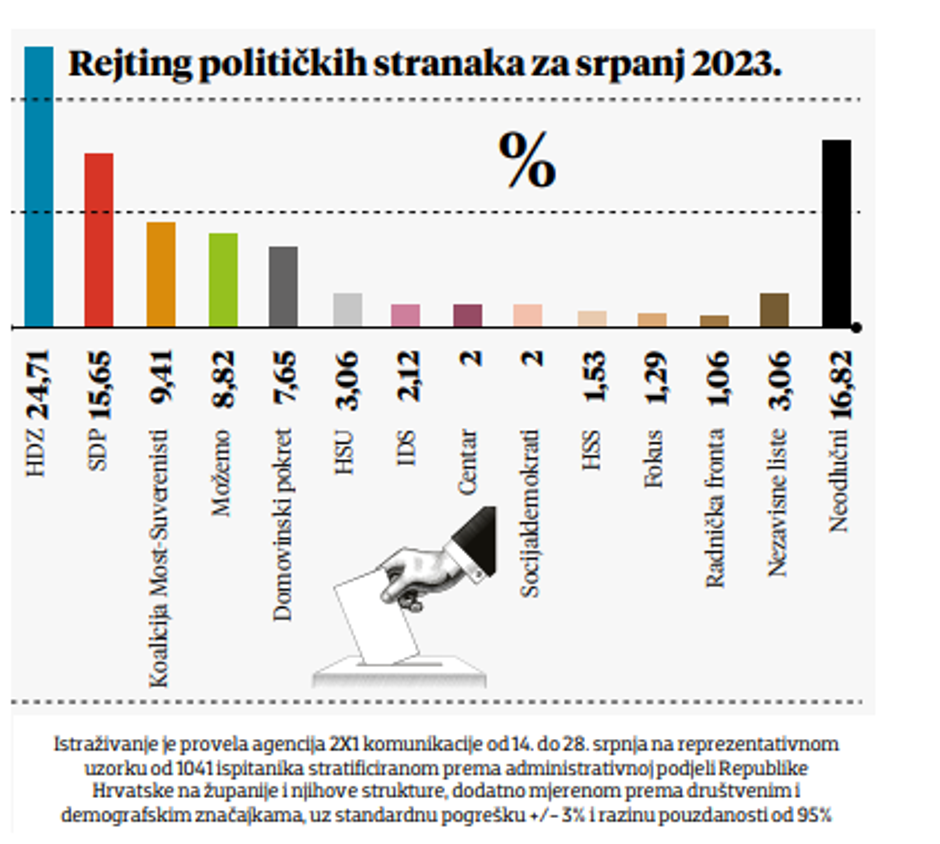 Naime, kada bi se iduće nedjelje održali parlamentarni izbori i da je cijela Hrvatska jedna izborna jedinica, istraživanje provedeno od 14. do 28. srpnja, na reprezentativnom uzorku od 1041 ispitanika, pokazalo je da bi jedino HDZ zabilježio pad, i to gotovo neznatan u odnosu na lipanjske rezultate. Jer HDZ bi, i uz novu plinsku aferu i uz drugi najdulji štrajk u povijesti Hrvatske i uz izvanrednu sjednicu Sabora, osvojio mnogima i dalje nedostižnih 24,71% glasova birača.