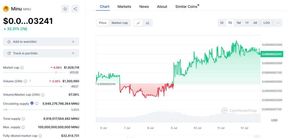 Cijena MINU tokena je dramatično porasla, a njime se sada trguje po cijeni od 0,0000003241 dolara. Tržišna kapitalizacija ovog tokena premašila je 32 milijuna dolara.