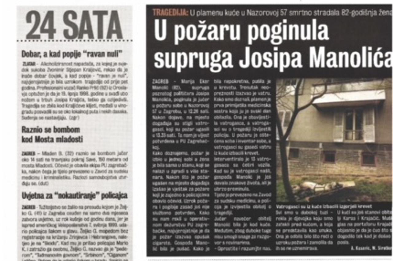 Slična se tragedija umalo dogodila i godinu dana ranije, kada je krevet Manolićeve supruge također zapalila cigareta, no tada je imala sreće - vatra je bila brzo ugašena. Kobnog dana, prije točno 20 godina, vatrogasci su požar uspjeli ugasili u 13.25, no za Manolićevu je suprugu, na žalost, bilo prekasno.