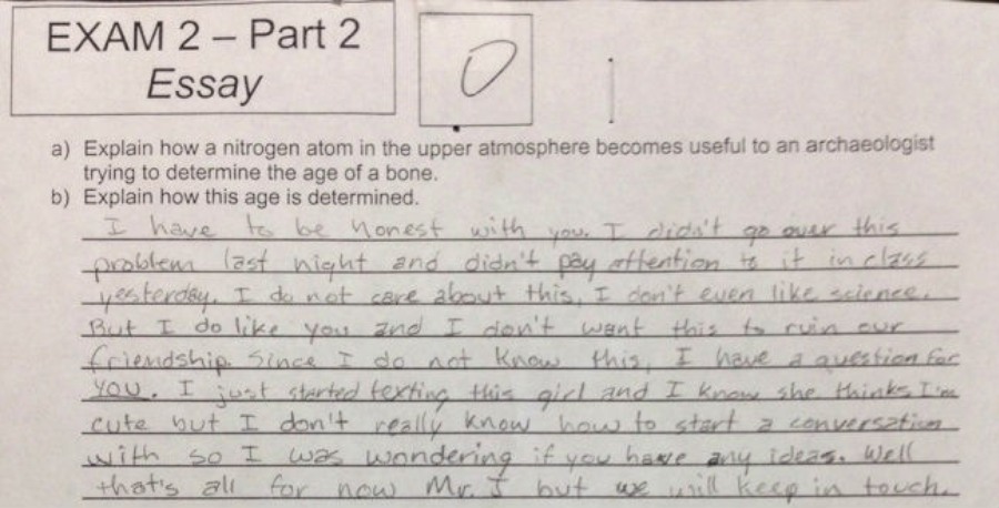 "Moram biti iskren, nisam učio ovaj dio i nisam pazio na satu jučer. Nije mi stalo do toga, ja čak ni ne volim znanost. No, volim vas i ne želim uništiti naše prijateljstvo. S obzirom da ne znam ovo, imam pitanje za vas. Počeo sam se dopisivati s jednom djevojkom i znam da ona misli da sam sladak, no ne znam kako da započnem razgovor pa sam se pitao imate li vi kakvih ideja. To je to zasad g. J, no čut ćemo se", napisao je srednjoškolac na svom ispitu.