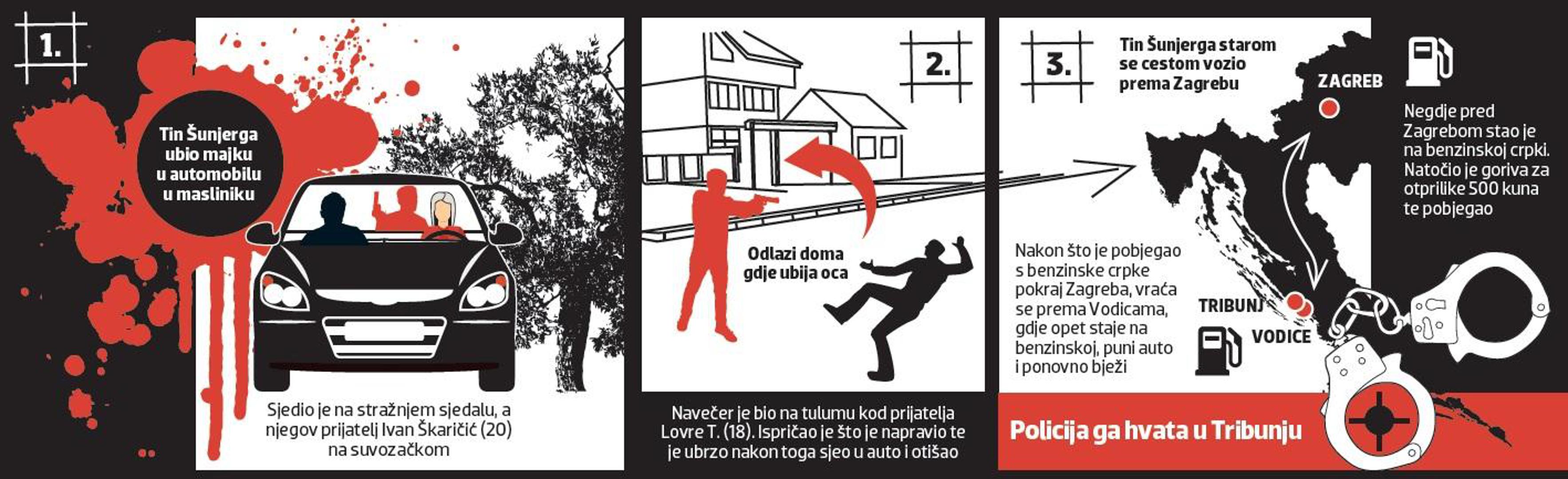 Tin Šunjerga (19) ubio je majku Silvu i oca Marina hicima iz očeva privatnog pištolja. Ukrao ga je iz sefa. Kasnije je pucao i na tulumu