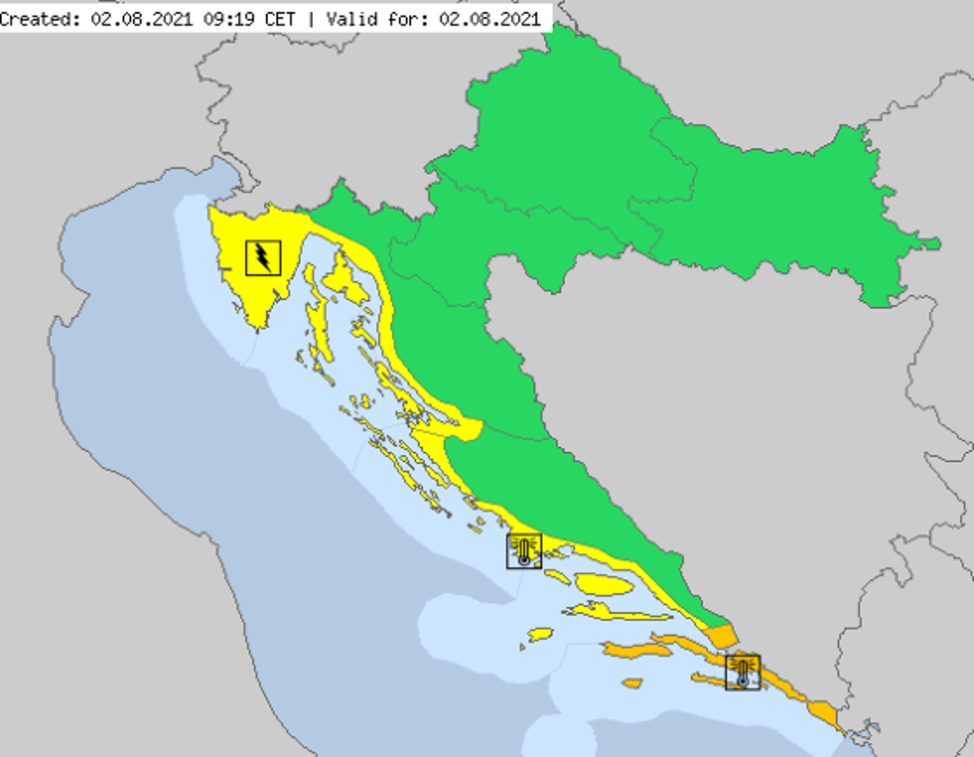 Na Jadranu će puhati većinom umjeren sjeverozapadni i zapadni, duž obale ponegdje i jugozapadni vjetar, a Meteoalarm je izdao i žuto upozorenje za Istru i Kvarner zbog potencijalnog nevremena.