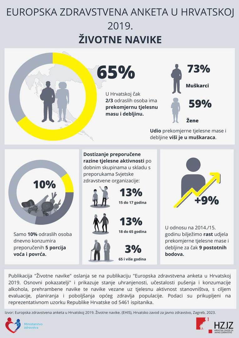 - Više od 90% smrti i obolijevanja dolazi od vodećih pet kroničnih bolesti kojima je u podlozi debljina. Kad bismo zaustavili taj problem, do 2050. godine spriječili bi razvoj pola milijuna kroničnih nezaraznih bolesti, samo smanjenjem tjelesne mase. Debljina je prvo stanje koje govori da će doći do skraćenja života za tri i pol godine – iznijela je dr. Sanja Musić Milanović, voditeljica Službe za promicanje zdravlja HZJZ-a, predstavljajući rezultate istraživanja "Europska zdravstvena anketa u Hrvatskoj 2019. Životne navike", trećeg kruga Europske zdravstvene ankete (European Health Interview Survey, EHIS). Debljinu ima 85% ljudi sa dijabetesom tipa 2, a dvije trećine osoba koje su imale moždani udar imalo je previše kilograma.