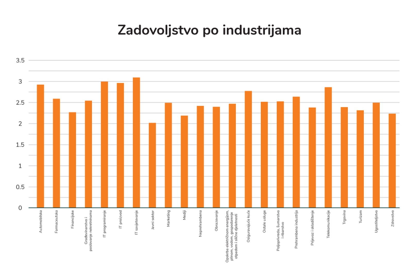 Najzadovoljniji su ljudi zaposleni u IT industriji – njihov je prosjek zadovoljstva 3,49, a slijedi automobilska industrija čije je zadovoljstvo u prosjeku 2,92 od 5. Najnezadovoljniji je javni sektor – prosjek zadovoljstva ljudi zaposlenih u ovom sektoru je tek 2,01.