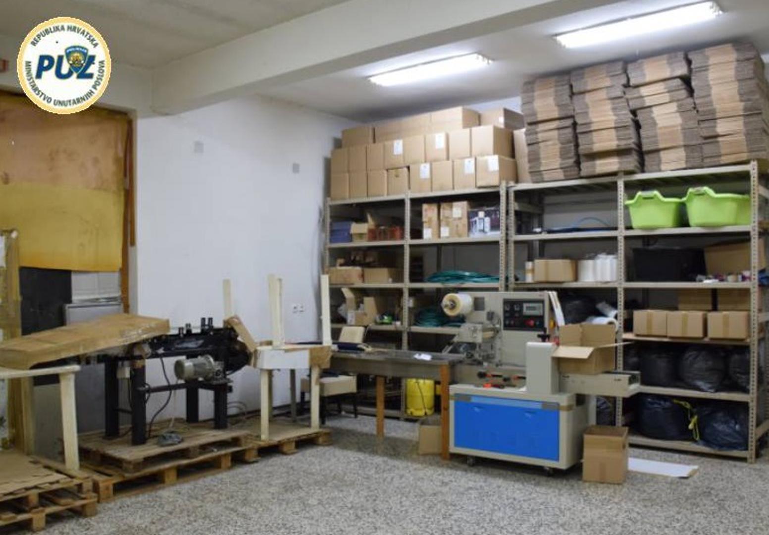 "S obzirom na to da u navedenom prostoru nitko nije zatečen, obavljen je nasilni ulazak te je utvrđeno da se skladište sastoji od tri međusobno povezane prostorije unutar kojih se nalazi jedan stroj za sitno rezanje duhana, dva prijenosna ovlaživača prostora, više dozatora punjenja, stroj za plastificiranje te 23 palete omotane celofanom s po 80 kutija u kojima se u svakoj nalazi po 110 paketa rezanog duhana mase 50 grama. Iz navedenog proizlazi da u svakoj kutiji ima 5,5 kg sitno rezanog duhana, a na svakoj paleti 440 kilograma sitno rezanog duhana, odnosno ukupno 10 120 kilograma sitno rezanog duhana pripremljenog za transport i prodaju", izvijestili su iz policije.