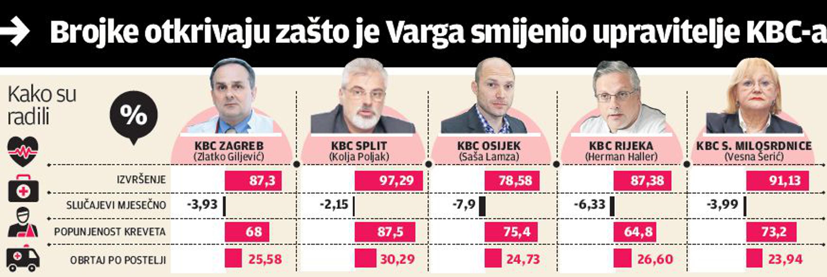 Brojke koje pokazuju kako su lani, točnije u prvih devet mjeseci prošle godine, ove bolnice radile manje nego godinu prije, bile su dovoljan pokazatelj Vargi da mora reagirati. A te brojke, primjerice, pokazuju kako je osječka bolnica odradila 78,58 posto od ugovorenih usluga te da je u istom tom KBC-u broj slučajeva, odnosno pacijenata, u godinu dana pao gotovo osam posto. Nadalje, popunjenost kreveta u riječkoj bolnici iznosi 65 posto, a u najvećem kliničkom bolničkom centru, zagrebačkom Rebru, ta brojka iznosi tek 68 posto, a podaci su za sve kliničke bolničke centre manje-više slični. Premda je reakcija ministra zdravlja, odnosno smjene sanacijskih upravitelja, izazvala kontroverze, on stoji iza svoje odluke i potkrepljuje ju brojkama o učinkovitosti rada pet najvećih hrvatskih bolnica.
