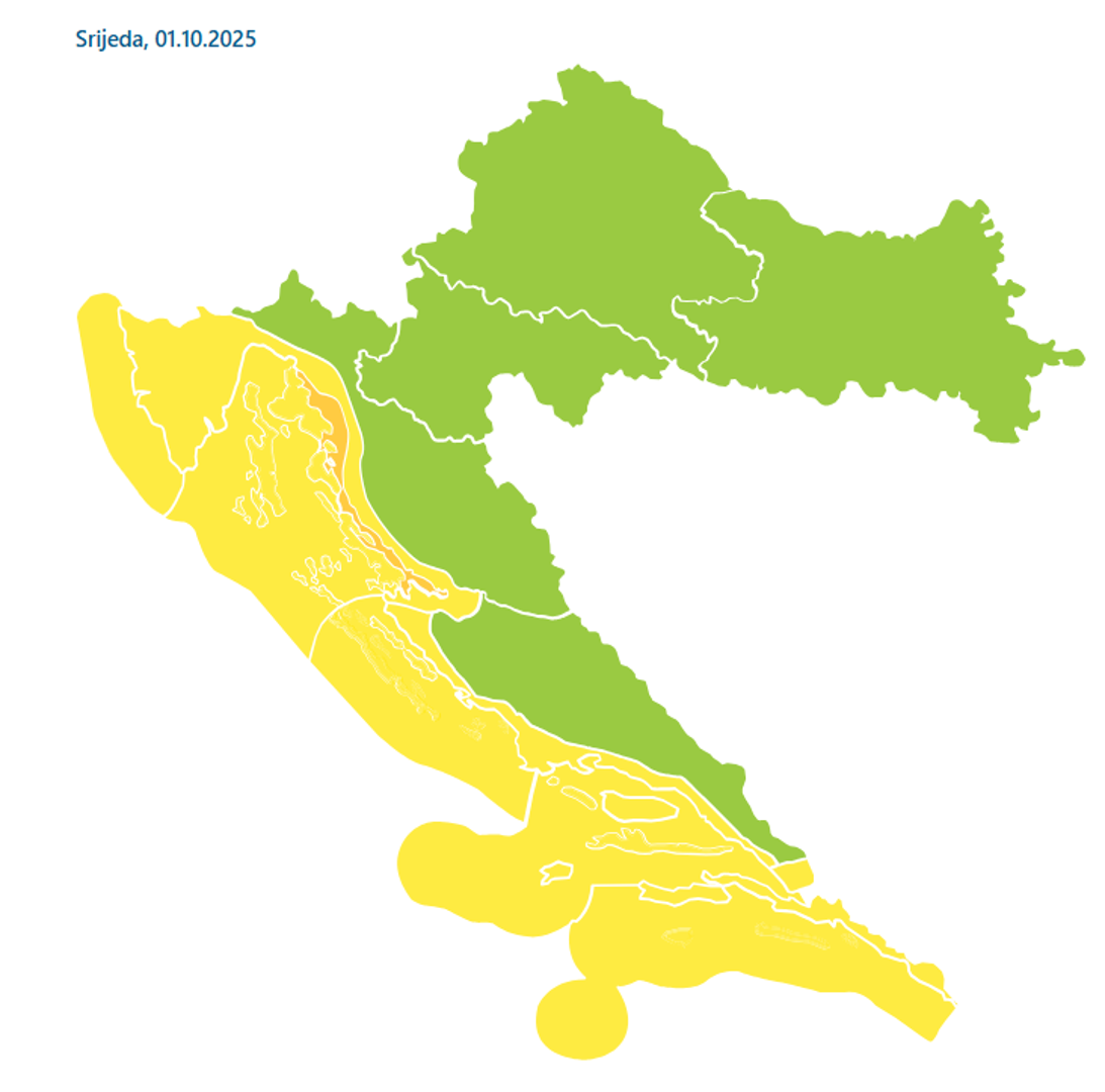 Na jugu Hrvatske pretežno sunčano i ugodno toplo – jutarnje temperature 12–17 °C, poslijepodnevne oko 24 °C. Sredinom tjedna očekuje se pad temperature, u unutrašnjosti u gorju jutarnjih oko 0 °C, uz povremeni umjeren sjeverni i sjeveroistočni vjetar. U većini krajeva bit će barem malo sunčanih sati, najviše u petak, a u srijedu i četvrtak povremena kiša i u najvišem gorju poneke pahulje. Na Jadranu će vrijeme biti promjenjivo i nestabilno, gotovo svakodnevno s mogućnošću pljuskova i sve hladnije, uz prevladavajuću buru, često jaku do olujnu, povremeno s orkanskim udarima, osobito u srijedu i četvrtak, kada se savjetuje oprez u plovidbi. DHMZ je izdao žuta i narančasta upozorenja zbog jakog vjetra i bure za područja duž obale koji će u narednim danima biti sve izraženiji.