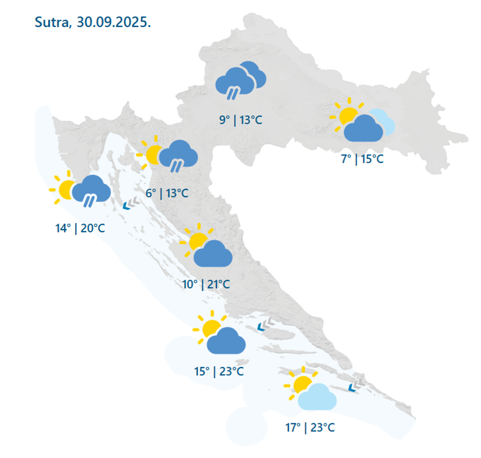 Na zapadu zemlje očekuje se malo sunčanih sati, puno oblaka i povremena kiša, češća u Gorskoj Hrvatskoj. Bura i istočnjak bit će slabi do umjereni, navečer jačaju, pa će more biti malo do umjereno valovito. Temperatura ujutro 4–9 °C, na sjevernom Jadranu 12–16 °C, a poslijepodne 18–21 °C, u gorju 9–15 °C. Južnije će biti sunčanije i toplije, poslijepodne 20–24 °C, a ujutro 7–10 °C, uz more oko 15 °C. Tijekom dana sve oblačnije, uz malu šansu za kišu, dok će bura popustiti, a zapuhat će jugozapadnjak, navečer ponovno jača.