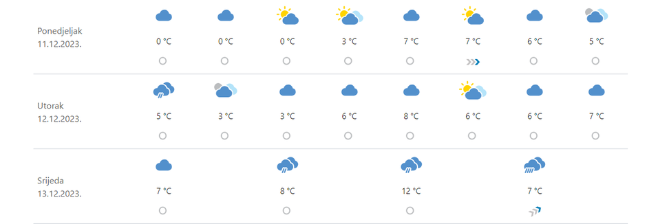 Prema metogramu za idućih nekoliko dana, početak idućeg tjedna trebao bi suh uz oblačno vrijeme, a temperatura će se u Zagrebu kretati između 0 i 7 Celzijevih stupnjeva. S utorkom dolazi poboljšanje vremena i više temperature, dok se u srijedu očekuje visokih 12 Celzijevih stupnjeva uz oborine. U četvrtak će dnevna temperatura biti između 10 i 3 stupnja, a već će u petak početi polako padati, no zato dolazi sunčano vrijeme.