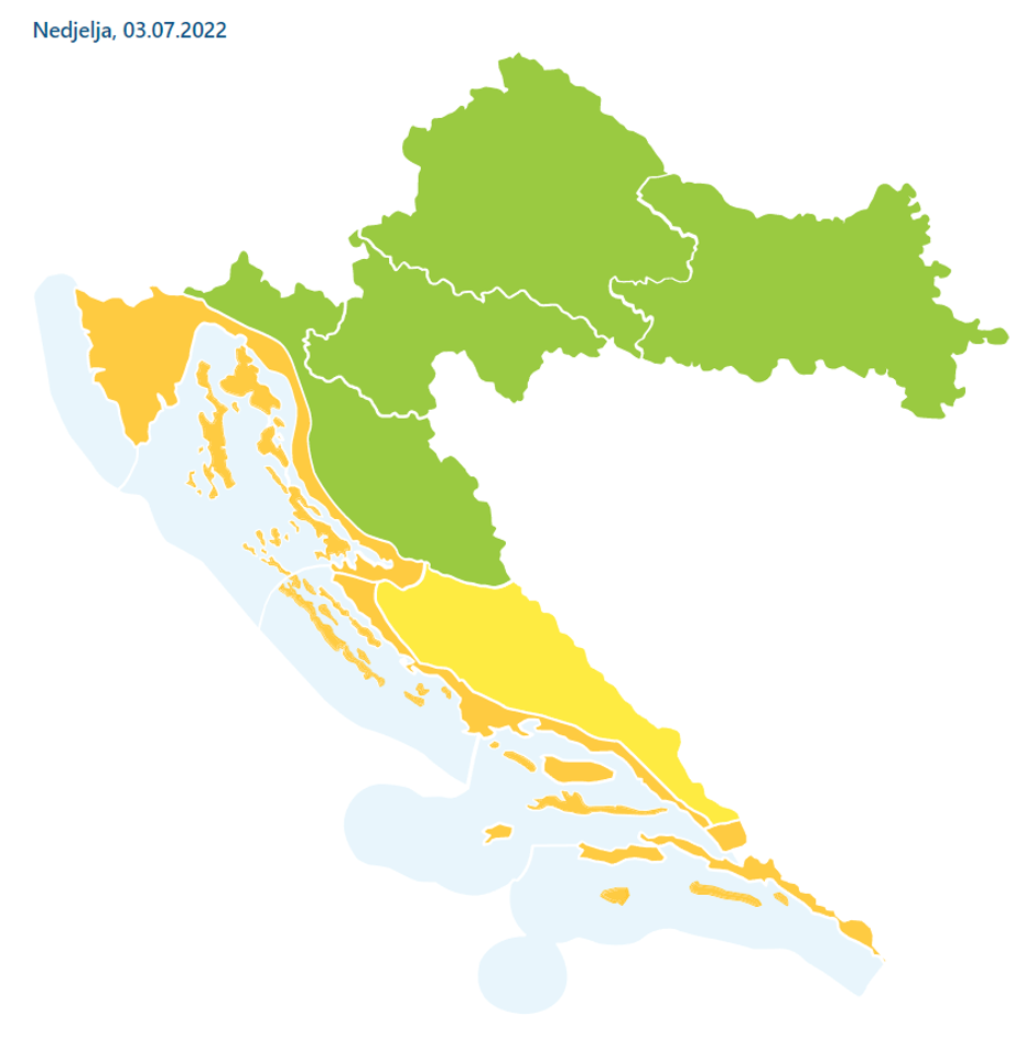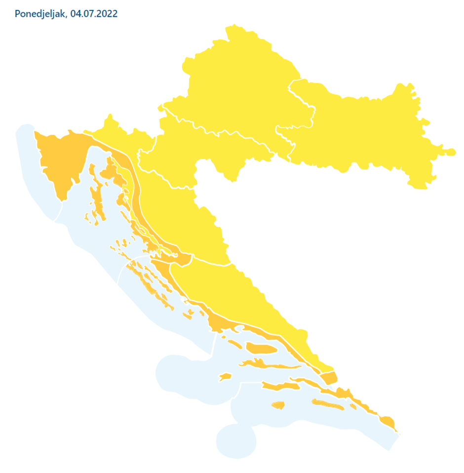 Za sutra je za svaku regiju izdano žuto ili narančasto upozorenje. Razlog su pretežito iznimno visoke temperature te toplinski val. Narančasto upozorenje upaljeno je za riječku, splitsku te dubrovačku regiju.