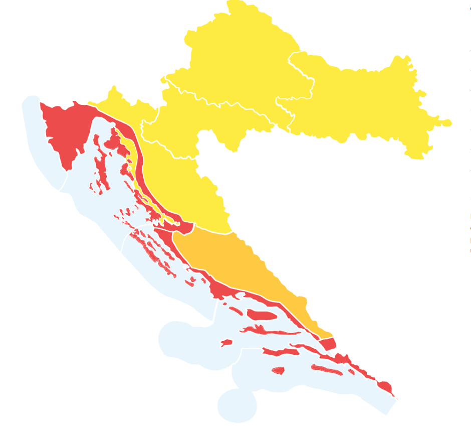Kao i danas, i u srijedu će na području tri regije biti upaljen crveni Meteoalarm - riječku, splitsku i dubrovačku. Za kninsku regiju bit će upaljeno narančasto upozorenje zbog toplinskog vala, dok će u ostatku Hrvatske vrijediti žuto.