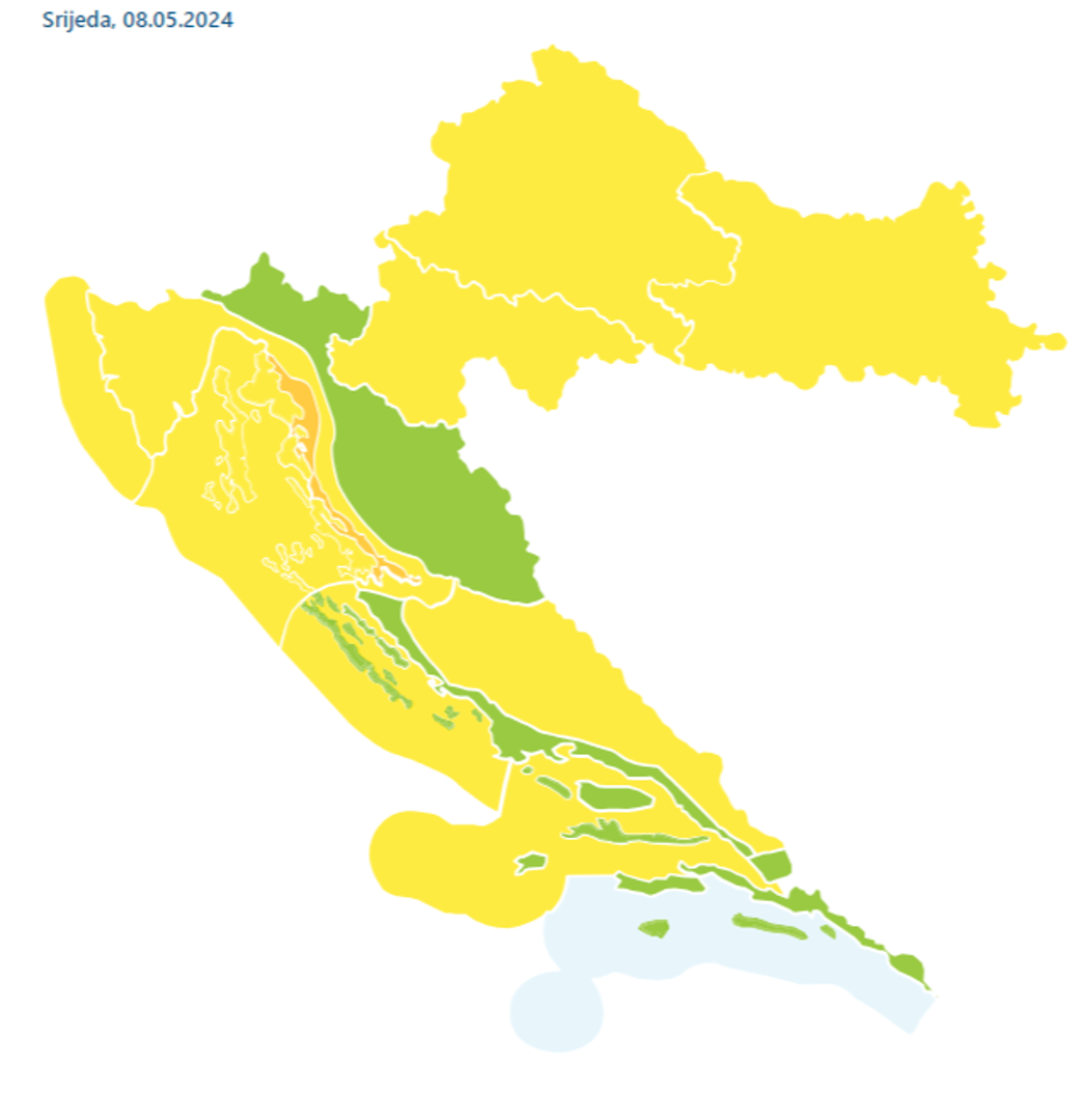 Cijelom Hrvatskom ove su srijede ''prošarani'' Meteoalarmi - u većini Hrvatske na snazi je žuto upozorenje zbog grmljavinskog nevremena u unutrašnjosti te jakog vjetra na obali, dok je na području Velebitskog kanala na snazi narančasti Meteoalarm zbog bure s udarima do 100 km/h. Upozorenja na snazi nisu tek u splitskoj i dubrovačkog regiji te u Lici i Gorskom kotaru.