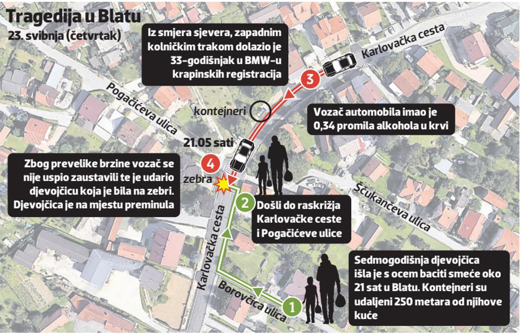 Najprije se začuo snažan udarac, a tek iza njega kočenje i škripa automobilskih guma. David Kotarski (33) koji je u četvrtak u 21.05 sati jurio debelo iznad ograničenja Karlovačkom cestom u novozagrebačkom Blatu uopće nije vidio sedmogodišnju Gretu Matošević koja je prelazila cestu na obilježenom pješačkom prijelazu prije nego se u nju zabio svojim crnim BMW-om krapinskih registarskih oznaka. Djevojčica je tek stigla ispustiti kratak vrisak prije nego se njezin život zauvijek ugasio.