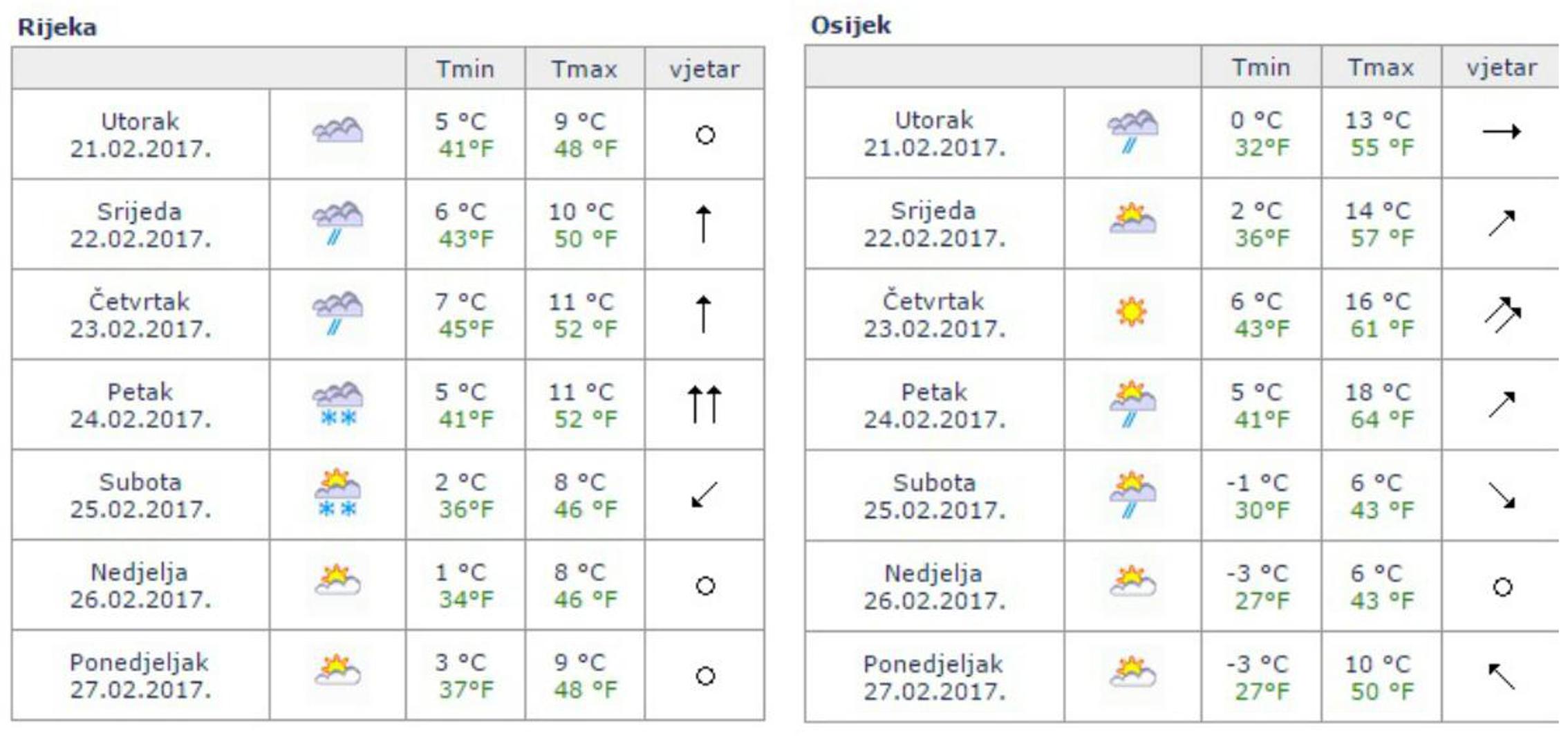 Najveću promjenu u temperaturi u ovih sedam dana doživjet će stanovnici Osijeka. Oni će se do petka "grijati" na maksimalnim temperaturama od 13 stupnjeva danas, do čak 18 stupnjeva u petak, uz promjenjivo vrijeme (danas i u petak moguća je kiša). Za vikend slijedi veliki pad temperature koja će se ujutro spustiti ispod nule, a maksimalna će doseći "mršavih" 6 stupnjeva Celzijevih. Slične vremenske prilike Osječani će imati u nedjelju i ponedjeljak.
