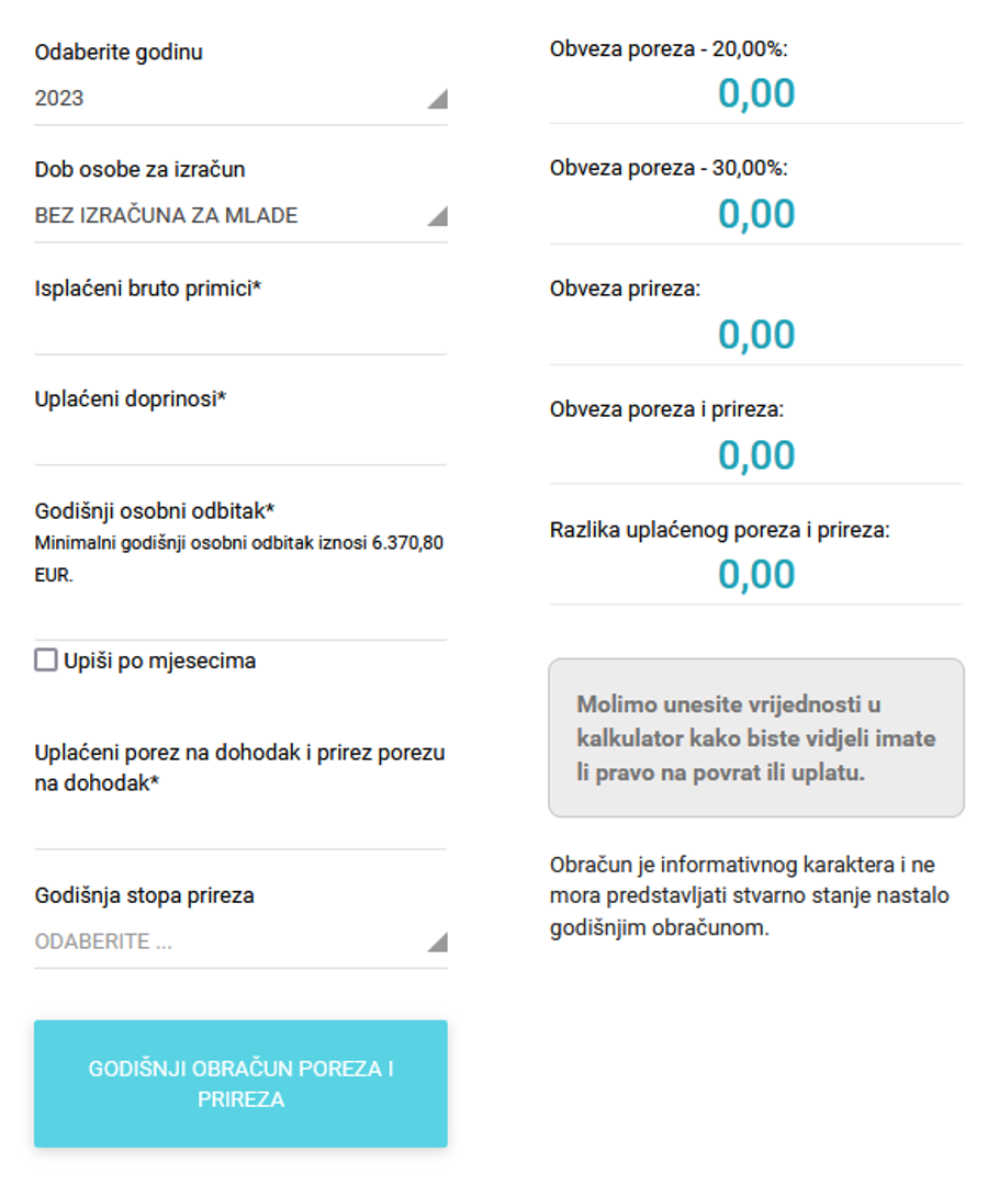 "Kalkulator godišnjeg obračuna poreza na dohodak i prireza poreza na dohodak služi informativnom obračunu i simulaciji razlike (uplate/povrata) iznosa poreza na dohodak i prireza poreza na dohodak na temelju unosa sljedećih podataka: