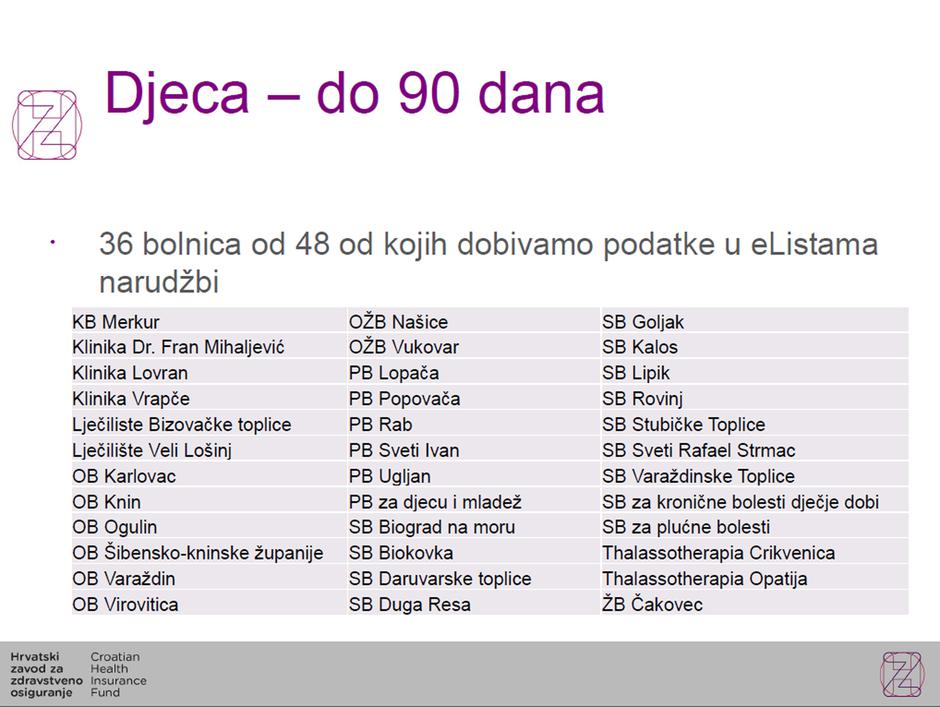 U 36 od 48 bolnica djeca do 18 godina sada dolaze na red unutar 90 dana, što je bio cilj – rekla je ravnateljica Hrvatskog zavoda za zdravstveno osiguranje Tatjana Prenđa Trupec u utorak na novinarskom brifingu. Ta velika vijest za male pacijente prezentirana je novinarima uz projekciju na kojoj je nabrojeno tih 36 bolnica. Međutim, dobar dio tih bolnica – i ne prima djecu.
