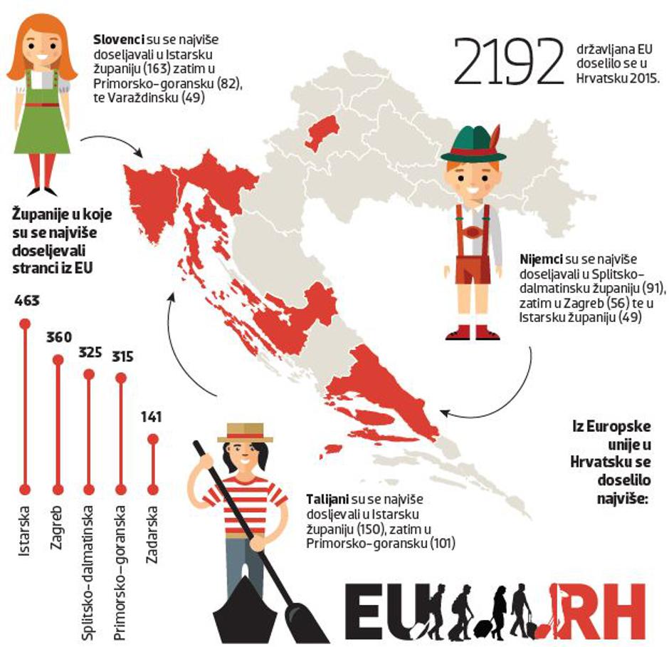 U tih deset godina, uz Zagreb koji je narastao za 22,5 tisuća stanovnika te Zagrebačku županiju, stanovništvo je povećano samo u navedene četiri županije uz obalu, a najviše u Zadarskoj, koja je u plusu za oko 8000 tisuća stanovnika. Iz EU su se u Hrvatsku 2015. godine doselila 2192 državljanina EU, a 2014. njih 2334. Prema podacima koje smo dobili od DZS-a, stranci iz EU najviše su se doseljavali u Istarsku, Splitsko-dalmatinsku, Primorsko-goransku, Zadarsku županiju i u grad Zagreb.