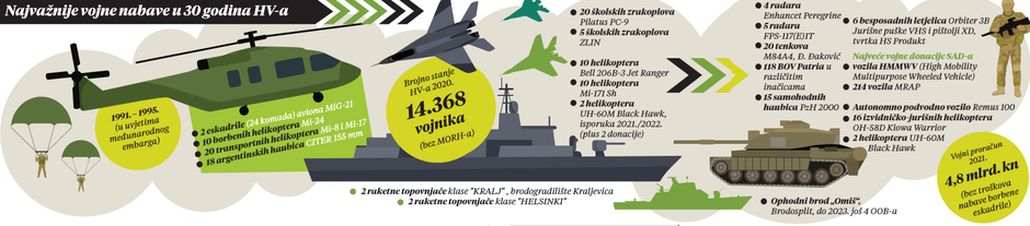 Krajem prošle godine nabavljene su od hrvatskog proizvođača i dvije superbrze brodice M-46. Važne su bile i donacije vlade SAD-a HV-u. Tijekom 2009. dostavljen je veći broj Humveeja, 2014. stiže 214 minski otpornih MRAP-ova, HRM dobiva 2016. autonomno podvodno vozilo Remus 100, te veliku isporuku od čak 16 izvidničko-jurišnih helikoptera OH-58D Kiowa Warrior. Dva helikoptera Black Hawk, zadnja, također vrijedna donacija iz SAD-a, bit će isporučena 2022., kada stižu i dva koja je RH kupila. U godini korone hrvatski vojni proračun opet je smanjen i iznosi 4,8 milijardi kuna.