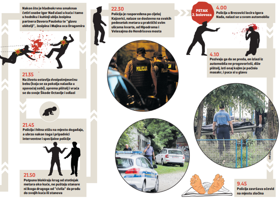 Upravo u trenucima dok su policajci zaprimali prve pozive uplašenih susjeda koji nisu bili sigurni što se to događa oko njih, Igor Nađ izlazio je iz Kajzerice, a gdje je proveo idućih nekoliko sati, za sada je još uvijek nepoznato. Ono što je poznato jest da ga je policija točno šest sati nakon ubojstva, dakle negdje oko 3.30 zatekla na cesti na području Brezovice.