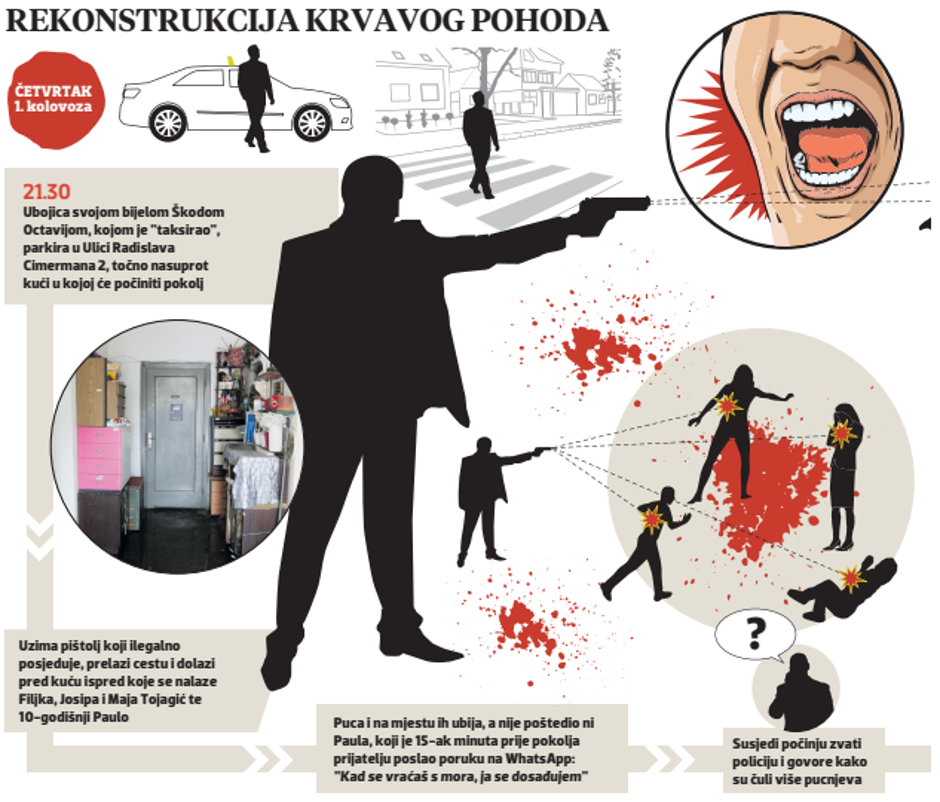 Nađ je na cesti ispred kuće svoju bijelu Škodu Octaviju parkirao minutu ili dvije prije 21.30 sati, uzeo je pištolj koji je, kako neslužbeno doznajemo, ilegalno posjedovao dulje vrijeme te je zatim s očito unaprijed dobro pripremljenim planom krenuo prema kući ispred koje su u tom trenutku bili njegova partnerica Maja Tojagić, njezine sestra i majka Josipa i Filjka te mali Paulo. Susjedi kažu kako nisu čuli nikakvu viku ili galamu prije nego što su krenuli pucnjevi tako da je Nađ vjerojatno odmah krenuo pucati.