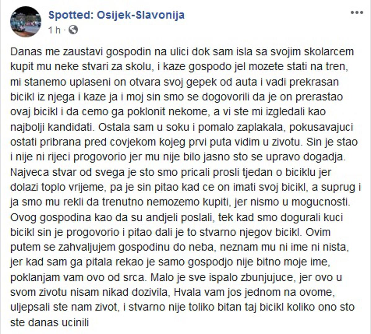 – Ostala sam u šoku i pomalo zaplakala, pokušavajući ostati pribrana pred čovjekom kojeg prvi put vidim u životu. Sin je stao i nije ni riječi progovorio jer mu nije bilo jasno sto se upravo događa. Najveća stvar od svega jest što smo razgovarali prošli tjedan o biciklu jer dolazi toplo vrijeme pa je sin pitao kad će on imati svoj bicikl, a suprug i ja smo mu rekli da mu ga trenutačno ne možemo kupiti jer nismo u mogućnosti. Ovog gospodina kao da su anđeli poslali, tek kad smo dogurali kući bicikl, sin je progovorio i pitao je li to stvarno njegov bicikl – ispripovijedala je žena.