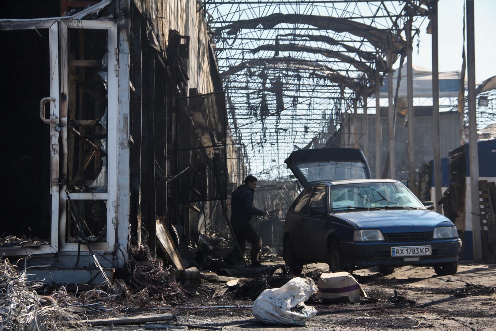 View of a crushed car amid the rubble as fire crews (not pictured) work after further attacks during Russia's invasion of Ukraine, in Kharkiv, March 14, 2022 in this still image from handout video. Courtesy of State Emergency Service of Ukraine/Handout via REUTERS THIS IMAGE HAS BEEN SUPPLIED BY A THIRD PARTY.