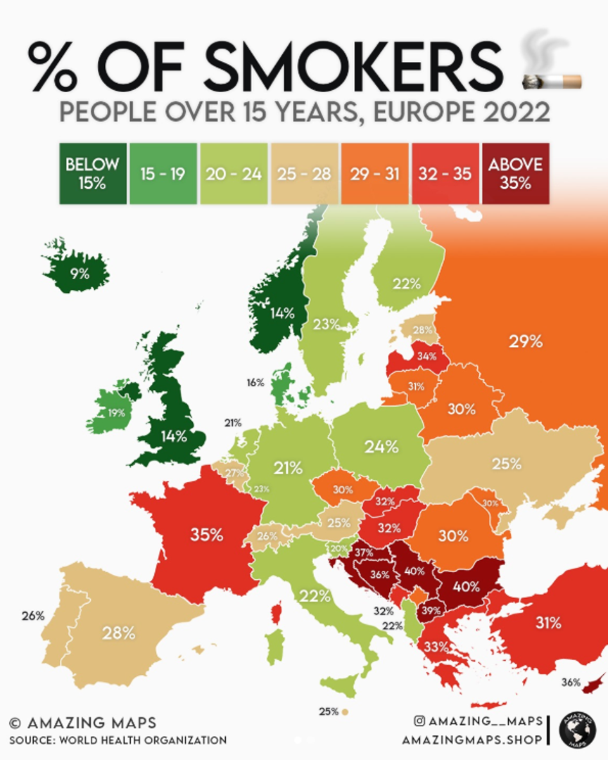 Jednostavna karta Europe, objavljena na Instagram profilu "Amazing Maps", privukla je veliku pažnju prikazom jedne od najštetnijih navika današnjice - pušenja. Infografika, koja bojama od zelene do jarko crvene prikazuje postotak pušača u europskim zemljama, donijela je otrežnjujuću sliku, osobito za stanovnike s područja Balkana. Dok su zemlje na sjeveru Europe poput Islanda (9%) i Velike Britanije (14%) obojene umirujućim zelenim tonovima, gotovo cijeli Balkanski poluotok "gori" u crvenom, signalizirajući stope pušenja koje su među najvišima na kontinentu. Podaci su preuzeti od Svjetske zdravstvene organizacije (WHO) za 2022. godinu.