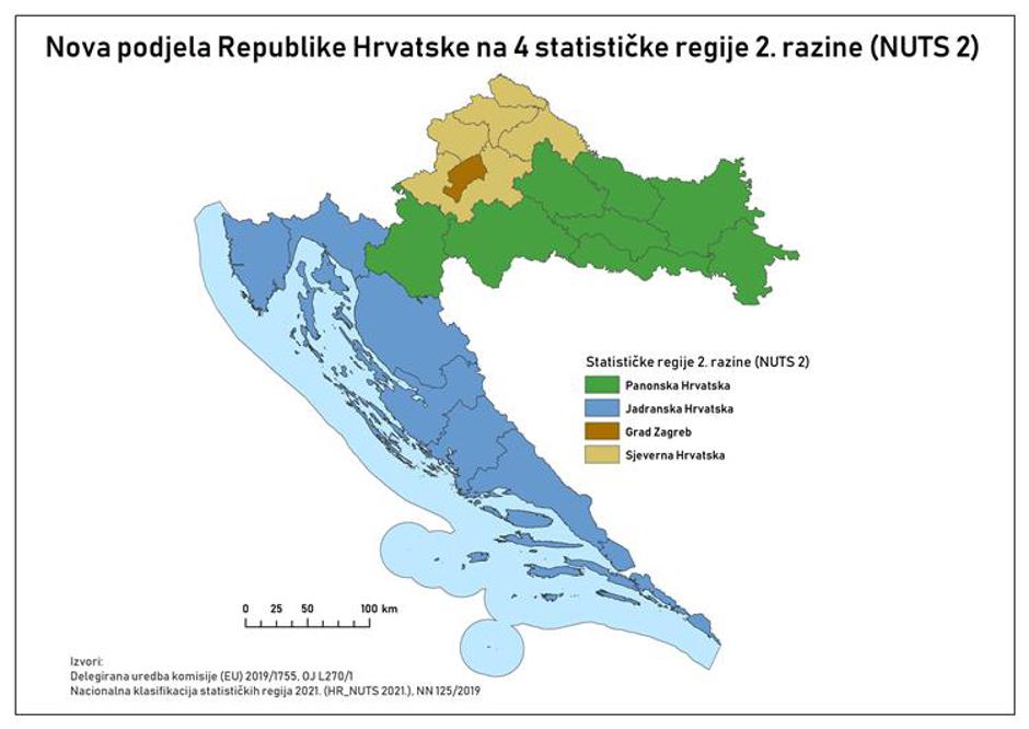 Europska komisija odobrila je danas novu statističku podjelu Hrvatske na četiri umjesto na dosadašnje dvije regije. Umjesto Jadranske Hrvatske i Kontinentalne Hrvatske, od 1. siječnja 2022. statističke EU regije koje su prihvatljive za nove regionalne potpore za ulaganja iz EU fondova u našoj zemlji bit će Jadranska Hrvatska, Sjeverna Hrvatska, Grad Zagreb i Panonska Hrvatska.