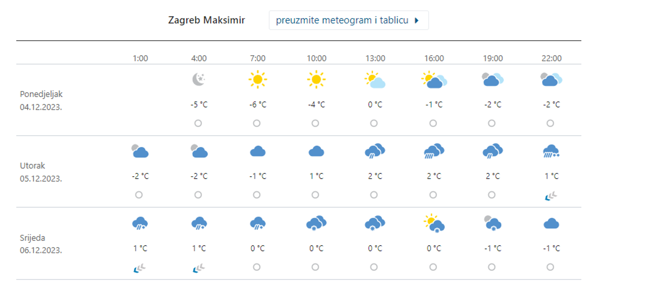 U srijedu nam se opet vraća snijeg. Prema meteogramu DHMZ-a, kiša će i u unutrašnjosti već u noći na srijedu prelaziti u snijeg, a oborina će biti cijeli dan. U petak nešto mirnije vrijeme, a za vikend opet nestabilno.