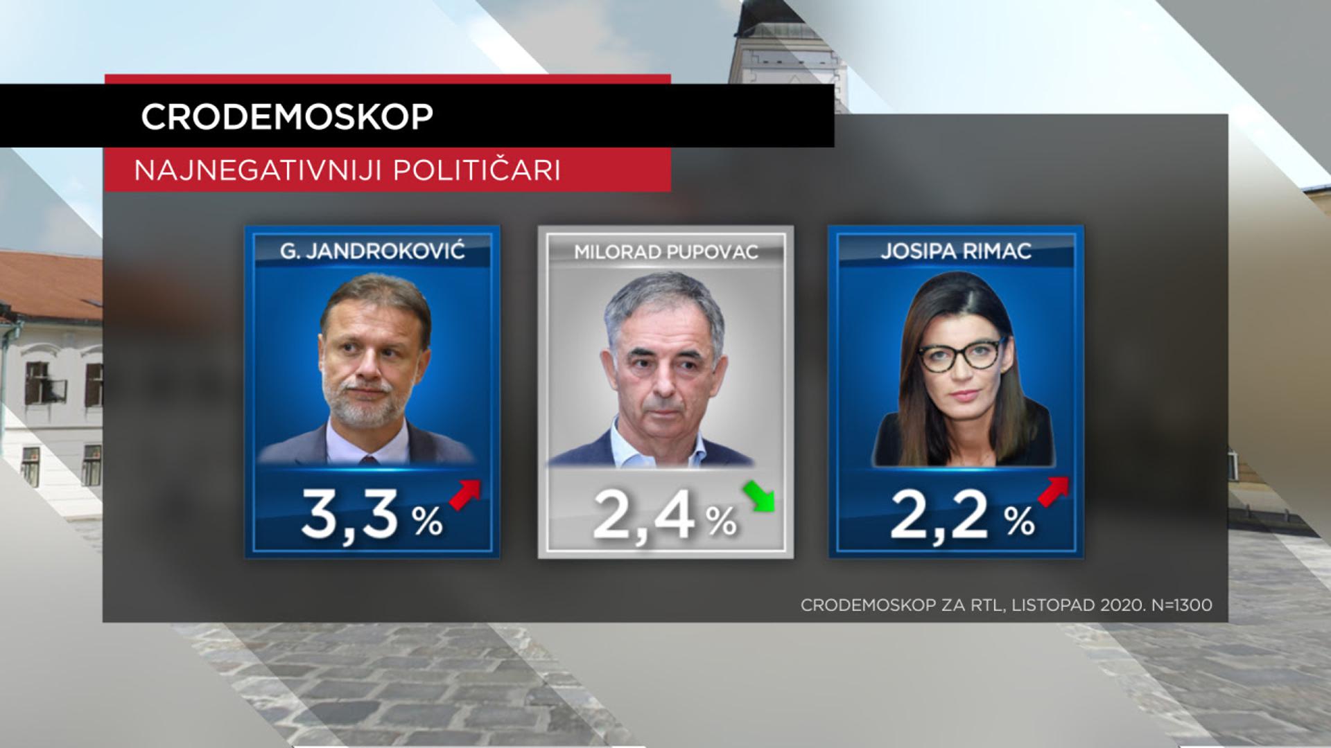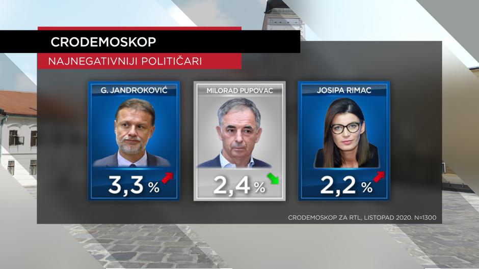 Slijede Gordan Jandroković (3,3%), Milorad Pupovac (2,4%) pa Josipa Rimac (2,2%) - bivša HDZ-ova političarka, sada USKOK-ova osumnjičenica nedavno puštena iz pritvora.