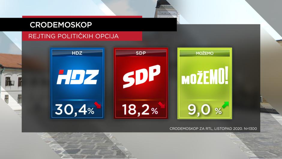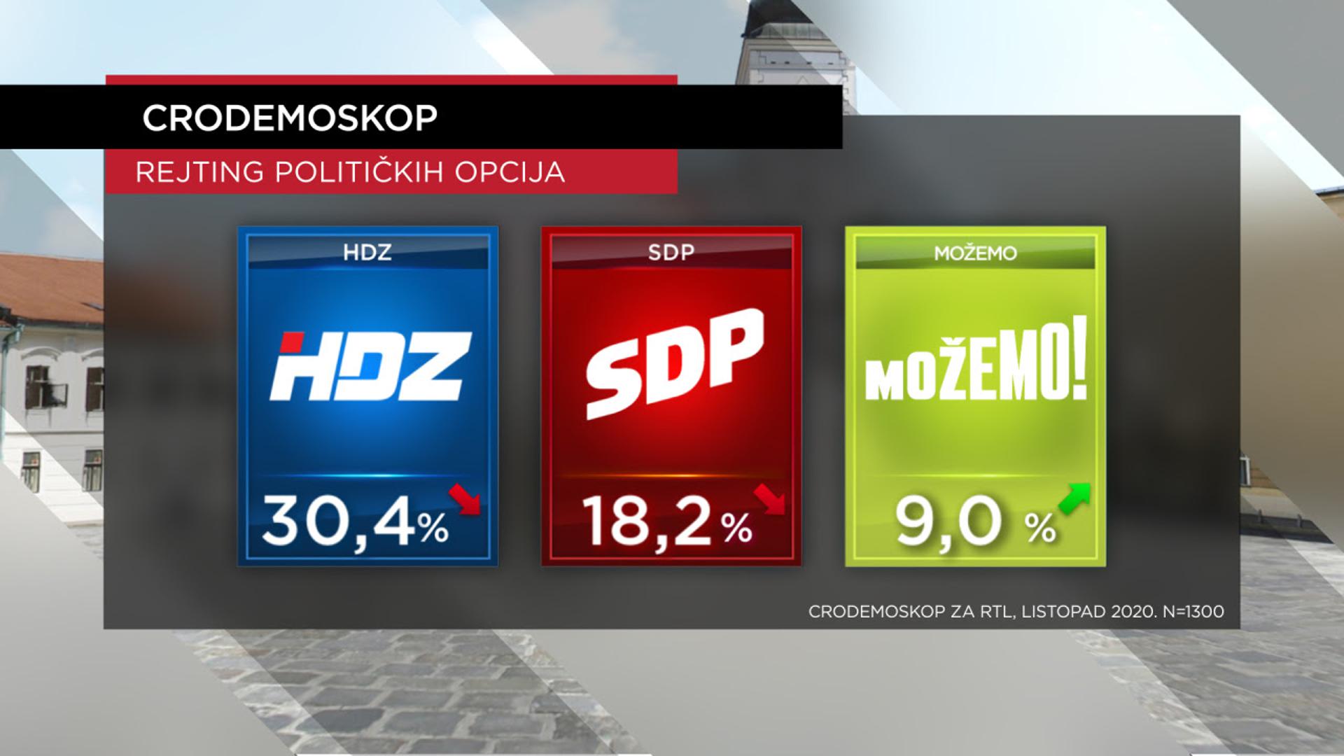 Iako uz blaži pad rejtinga, najviše ispitanika, 30,4 posto bira HDZ. Drugi je SDP, koji je odabrao novog predsjednika ali mu je bivši pomrsio planove i doveo do pat pozicije.