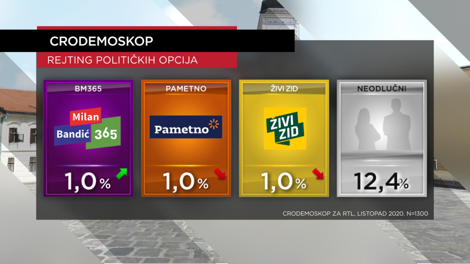 Tek jedan posto imaju stranka zagrebačkog gradonačelnika Bandić Milan 365, Pametno i Živi zid. Neodlučnih je nemalih 12,4 posto.