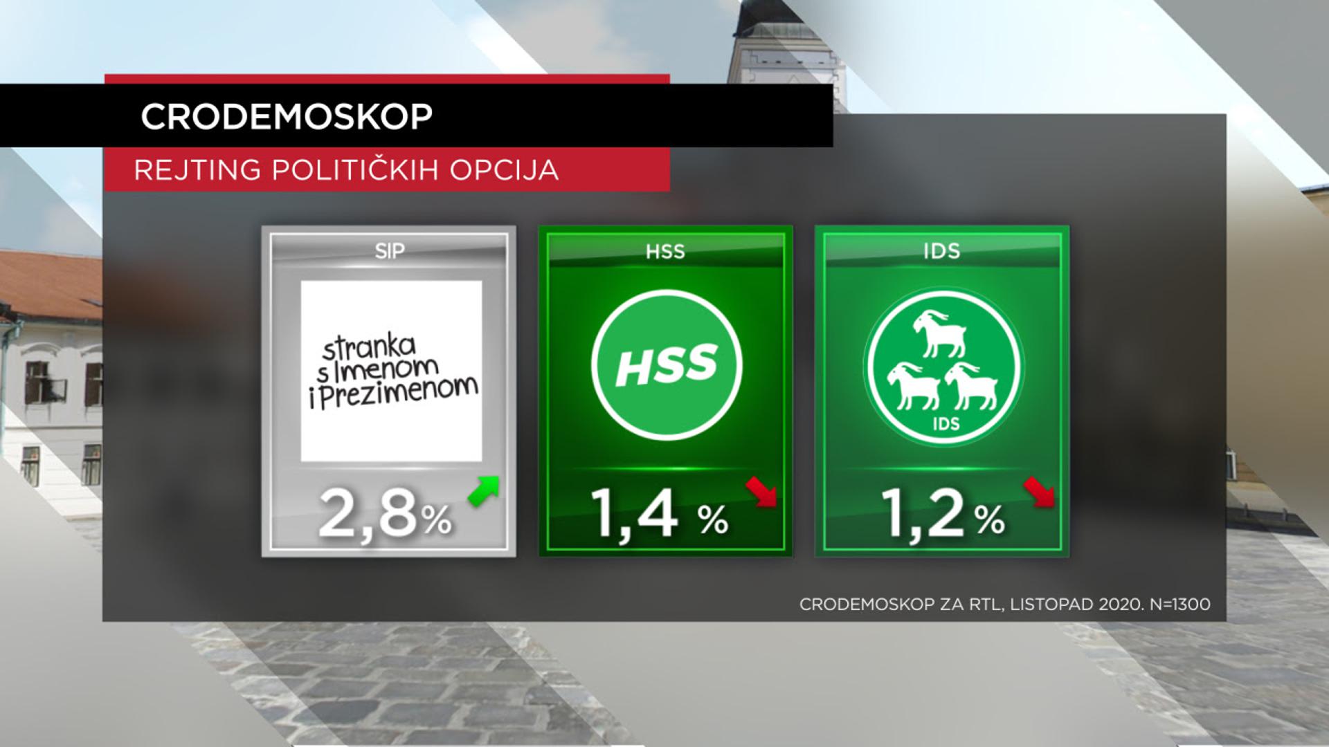 Stranci s imenom i prezimenom (SSIP) blago raste rejting (2,8%), slijede HSS (1,4%) i IDS (1,2%).