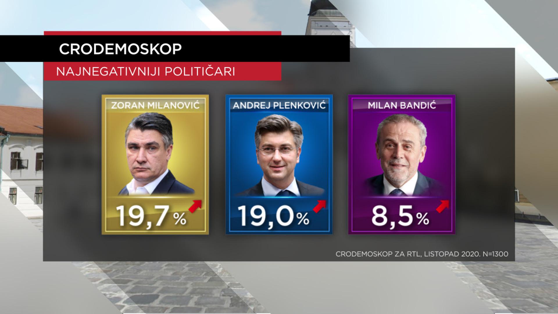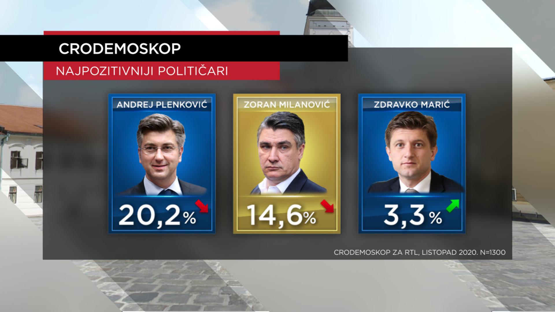 Na ljestvici najpozitivnijih političara vrh i dalje drži premijer Andrej Plenković. Stav je to petine ispitanika (20,2%), iako u odnosu na rujan bilježi pad od četiri postotna boda.