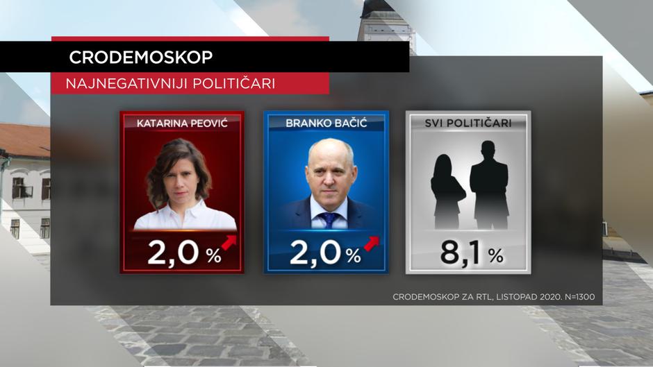 Na neprestižnu ljestvicu stigli su i Katarina Peović (2,0%) i Branko Bačić (2,0%), a da su negativni svi političari misli 8,1 posto ispitanika.