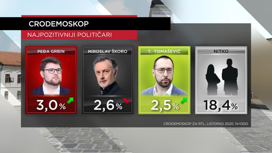 Još niži je pozitivni doživljaj Miroslava Škore (2,6%) i Tomislava Tomaševića (2,5%). Svi ostali bilježe još niži rejting, a Nitko je i dalje popularan (18,4%).