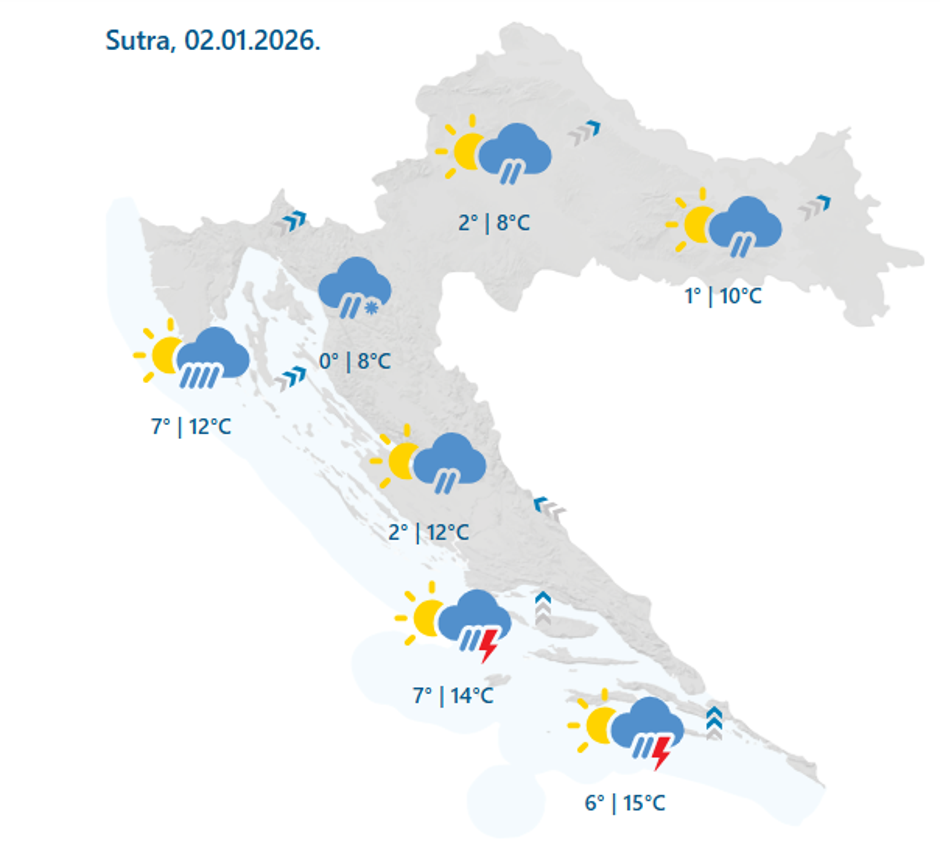 Novu godinu započeli smo s hladnim jutrom, 'zubatim' suncem i suhim vremenom. Temperature su išle u do - 6 Celzijevih stupnjeva. 'U Gorskoj Hrvatskoj mjestimice snijeg, a prema kraju dana sve je vjerojatnija i kiša koje će biti i na sjevernom te dijelu srednjeg Jadrana. Puhat će umjeren do jak jugozapadnjak, u gorju na udare i olujan, a na moru i južni vjetar te jugo. Navečer će vjetar biti i jači. Najviša dnevna temperatura zraka uglavnom od 5 do 10 °C', naveli su za prvi dan 2026. godine iz DHMZ-a.