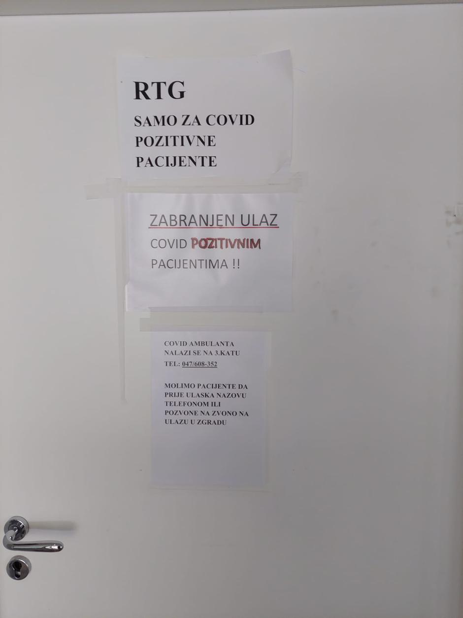 "Samo za Covid pozitivne pacijente", stoji na jednoj obavijesti. No, ono što je čudno je to što ispod toga stoji druga, potpuno oprečna informacija: "Zabranjen ulaz Covid pozitivnim pacijentima".