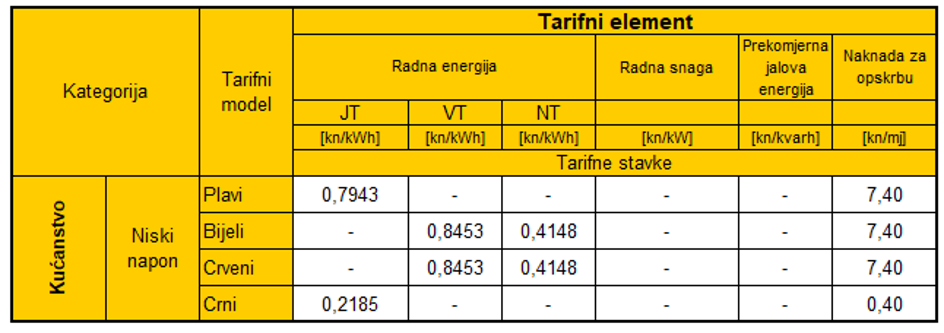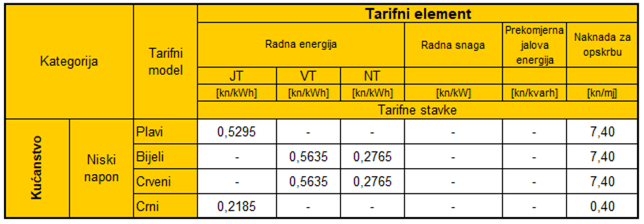 Tarifne stavke za kupce kategorije kućanstvo (jedinstveni račun - energija i naknada za korištenje mreže):