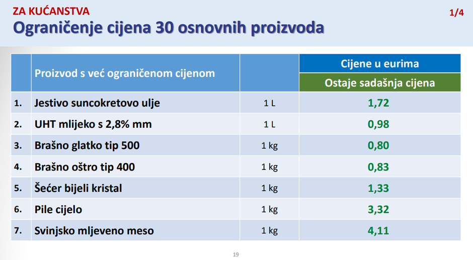 U sklopu novoga paketa mjera za zaštitu kućanstava i gospodarstva od rasta cijena, Vlada ograničava cijene za ukupno 30 proizvoda i to od danas. Novi paket mjera koji se odnosi na idućih šest mjeseci vrijedan je 464 milijuna eura, uz postojeći od 551 milijun eura, koliko ukupno vrijede mjere iz prethodnog paketa koje su na snazi godinu dana.