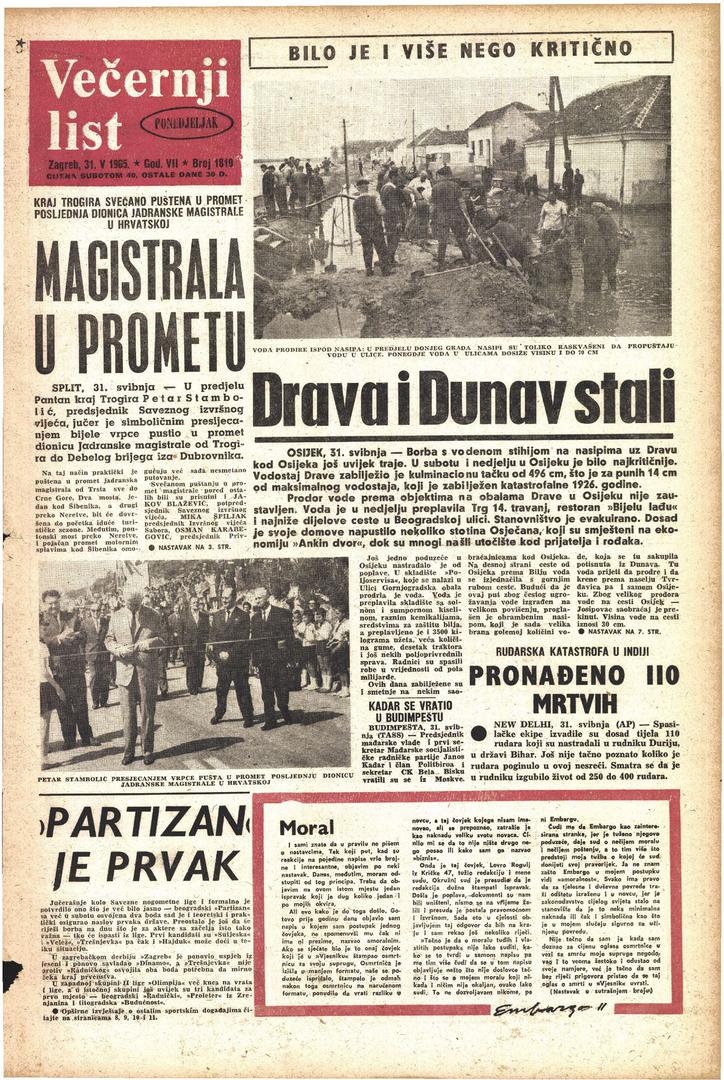 Presijecanjem bijele vrpce, 30. svibnja 1965. otvorena je posljednja, 291 kilometar duga, dionica ceste, od Trogira do Debelog Brijega, iza Dubrovnika. Tim je činom u promet puštena Jadranska magistrala, koja spaja Trst s Ulcinjem, a od ukupno 1006 km, čak 818 km prolazi kroz Hrvatsku. Prisjetili smo se kako se o tome pisalo u Večernjakovoj arhivi.