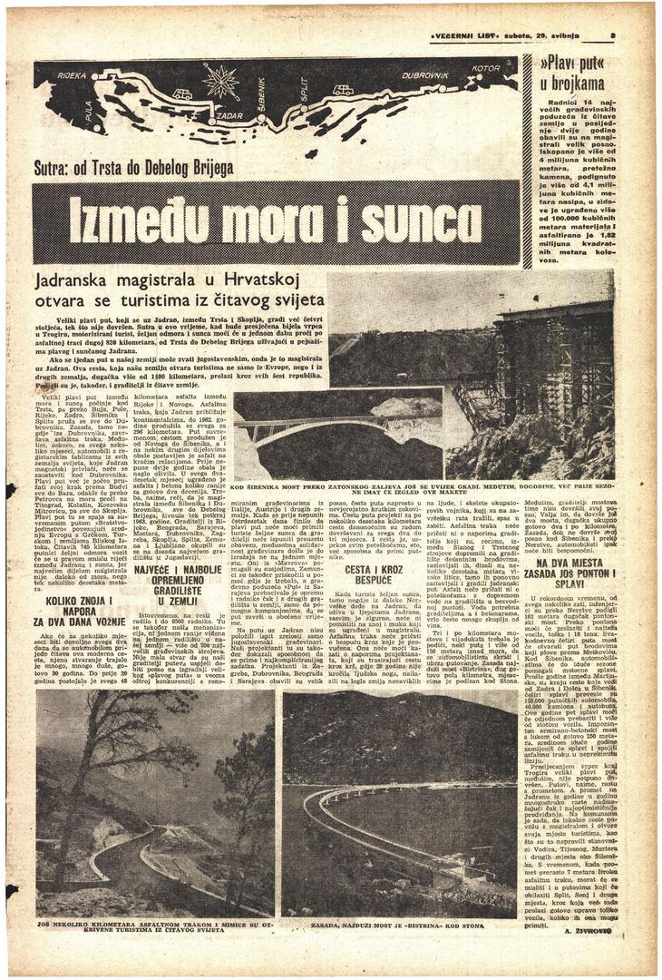 Veliki plavi put, koji se uz Jadran, između Trsta i Skoplja, gradi već četvrt stoljeća, tek što nije dovršen. Sutra u ovo vrijeme, kad bude presječena bijela vrpca u Trogiru, motorizirani turist, željan odmora i sunca moći će u jednom dahu proći po asfaltnoj traci dugoj 820 kilometara, od Trsta do Debelog Brijega uživajući u pejsažima plavog i sunčanog Jadrana. Ako se ijedan put u našoj zemlji može zvati jugoslavenskim, onda je to magistrala uz Jadran. Ovako je Večernji list davne 1965., najavio otvaranje Jadranske magistrale, te impozantne prometne arterije. Bila je to jedna od ljepših priča koje su obilježile tu godinu.
