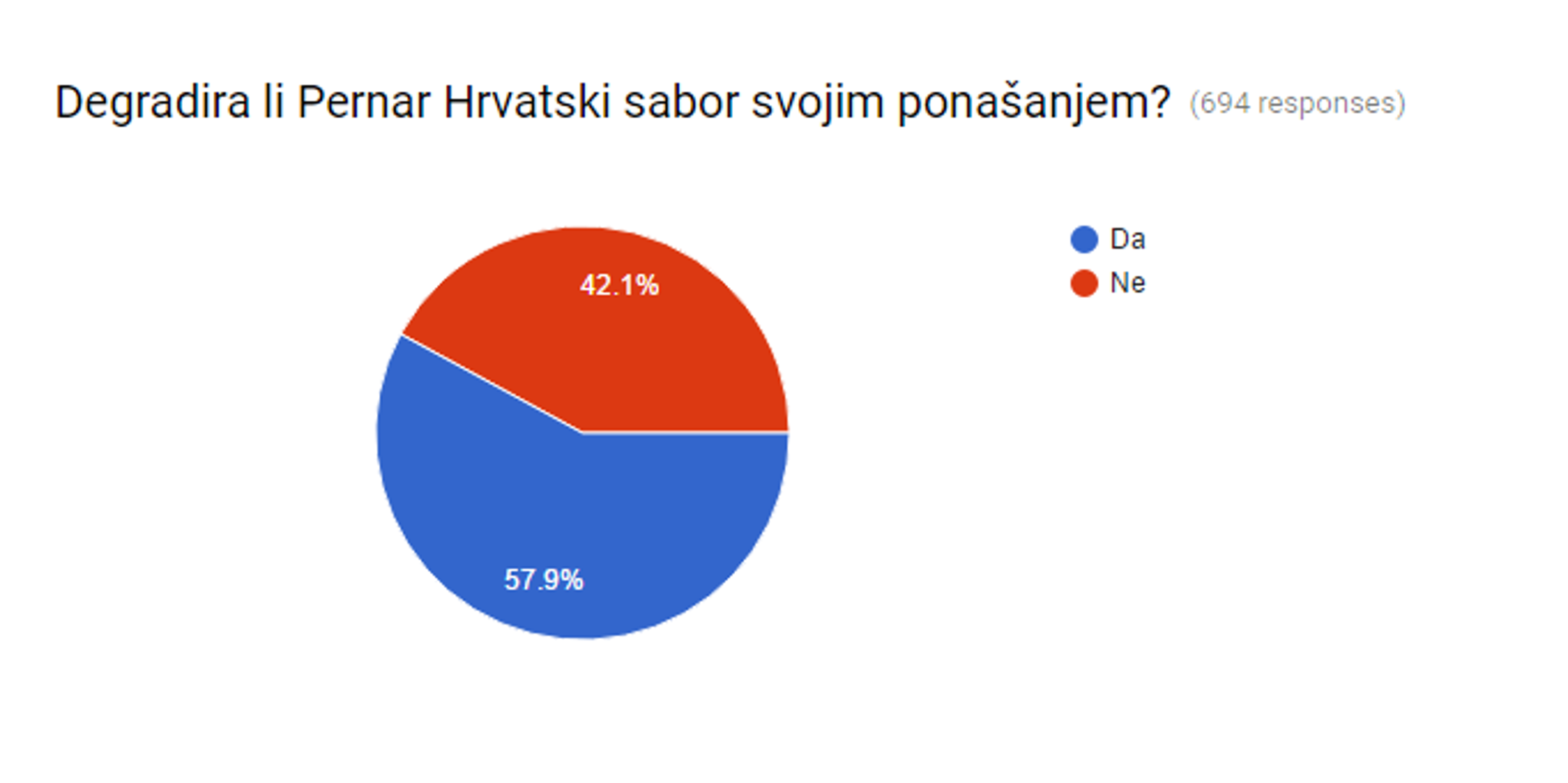Blago podijeljeni su bili samo oko pitanja degradira li Ivan Pernar Hrvatski sabor svojim ponašanjem, jer smatraju da i ostali političari svojim nedolaženjem na sjednice pokazuju nepoštovanje prema instituticiji. Ipak, ni ovdje brojke ne idu Pernaru u prilog jer je gotovo 58 posto odgovorilo da im njegovo ponašanje unutar Sabora - ipak smeta.