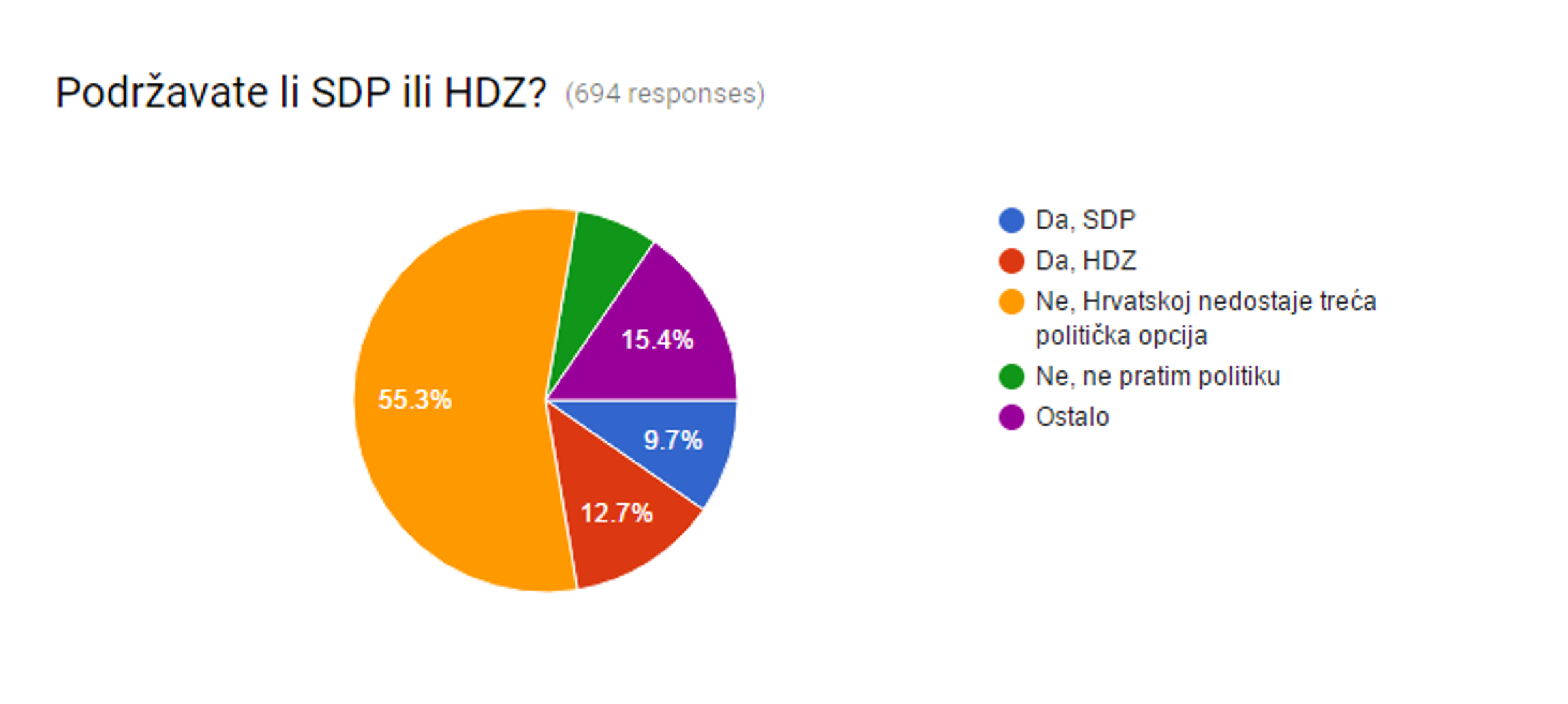 Važno je napomenuti da od 700 ispitanika njih 13 posto podržava HDZ, 10 posto SDP, 15 posto neku drugu stranku, dok više od polovice studenata (55,3%) smatra da Hrvatskoj nedostaje treća politička opcija.